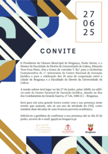 O Exmo. Sr. Presidente da Câmara Municipal de Bragança, Paulo Xavier, e o Diretor da Faculdade de Direito de Lisboa, Eduardo Vera-Cruz Pinto, convidam V. Ex.ª para a Cerimónia Comemorativa do 1.º Aniversário do Centro Nacional de Inovação Jurídica (CNIJ) e para a celebração dos 20 anos de cooperação entre a cidade de Bragança e a Faculdade de Direito da Universidade de Lisboa, que decorrerá no dia 27 de junho, pelas 16h00, no edifício-sede do Centro Nacional de Inovação Jurídica, situado na Rua dos Combatentes da Grande Guerra, n.º 146, 5300-111 – Bragança.