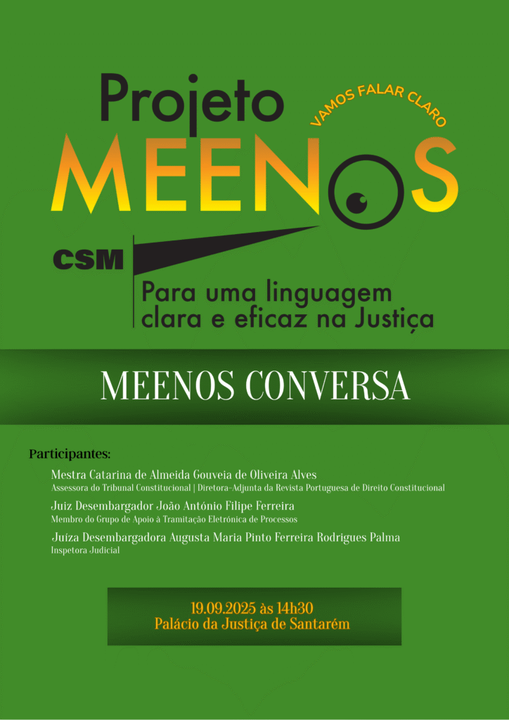 No dia 19 de setembro, no Palácio da Justiça I de Santarém, realizou-se uma mesa redonda do projeto “Meenos Conversa”, iniciativa do Conselho Superior da Magistratura destinada à sensibilização para a importância da adoção de uma linguagem mais simples, clara e objetiva nas decisões dos tribunais e da simplificação da sua estrutura.
