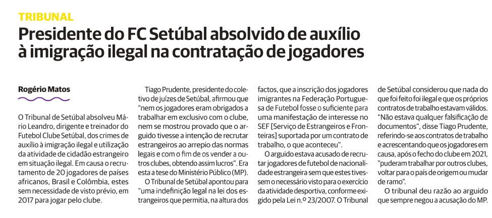Presidente do FC Setúbal absolvido de auxílio à imigração ilegal na contratação de jogadores
