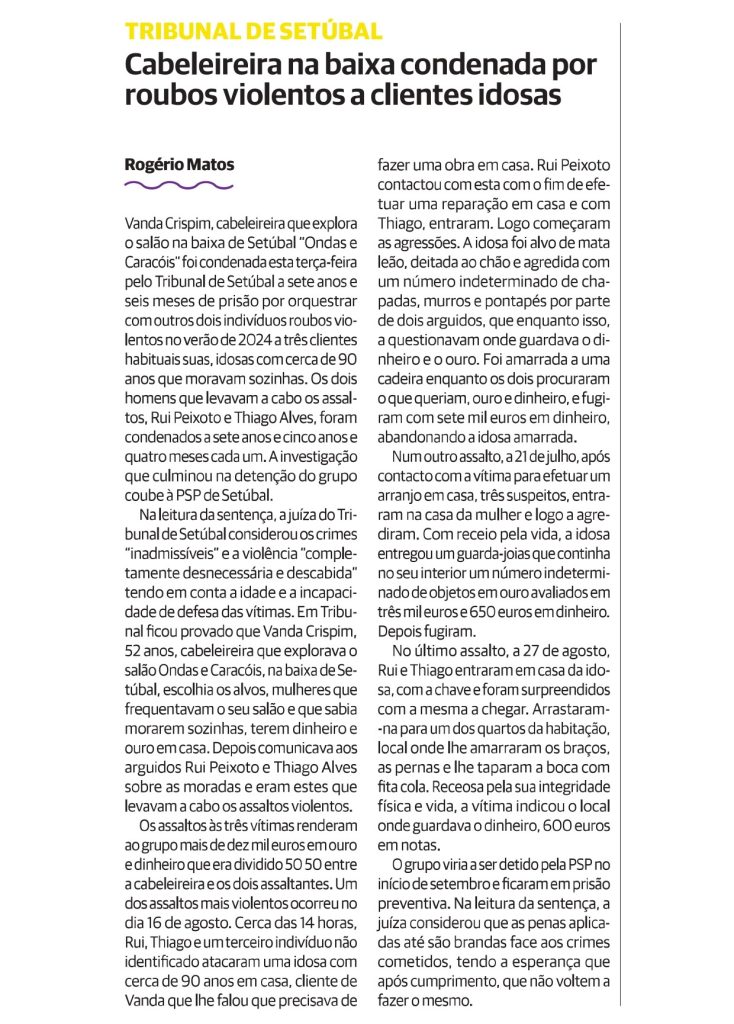 Cabeleireira na baixa condenada por roubos violentos a clientes idosas