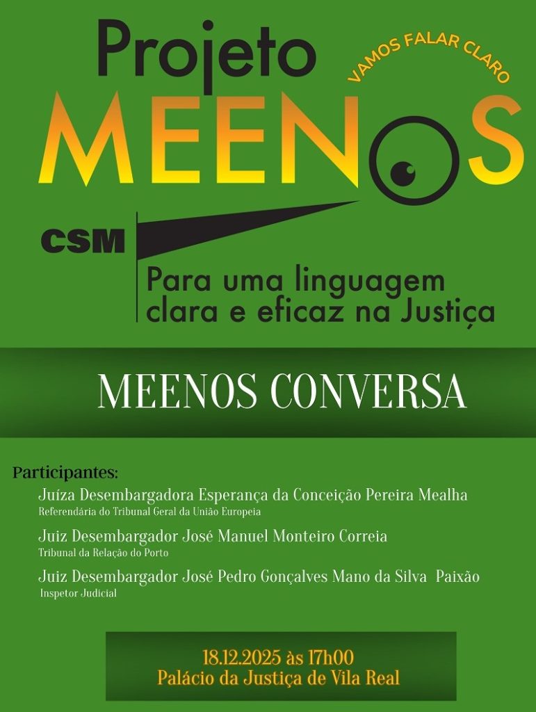 Vai decorrer no dia 18 de dezembro, no Tribunal Judicial de Vila Real da Av. Almeida Lucena, a formação do projeto MEENOS – Escrita simples e clara nas decisões judiciais, orientado para a promoção da acessibilidade, transparência e clareza comunicacional, conforme programa infra.